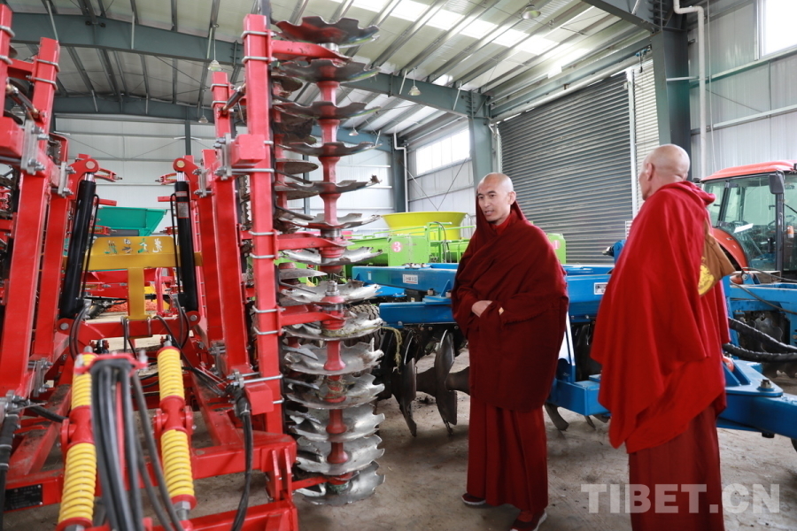 圖為甘孜縣甘孜寺的僧人江陽(yáng)克珠(左)正在觀察大型現(xiàn)代化農(nóng)業(yè)機(jī)械 攝影:劉莉