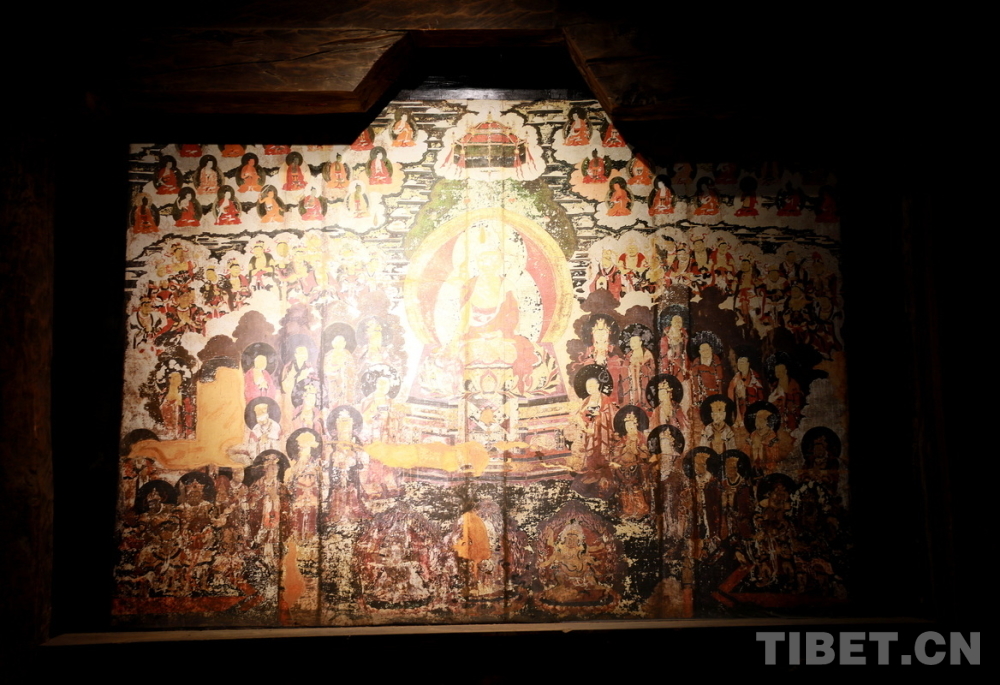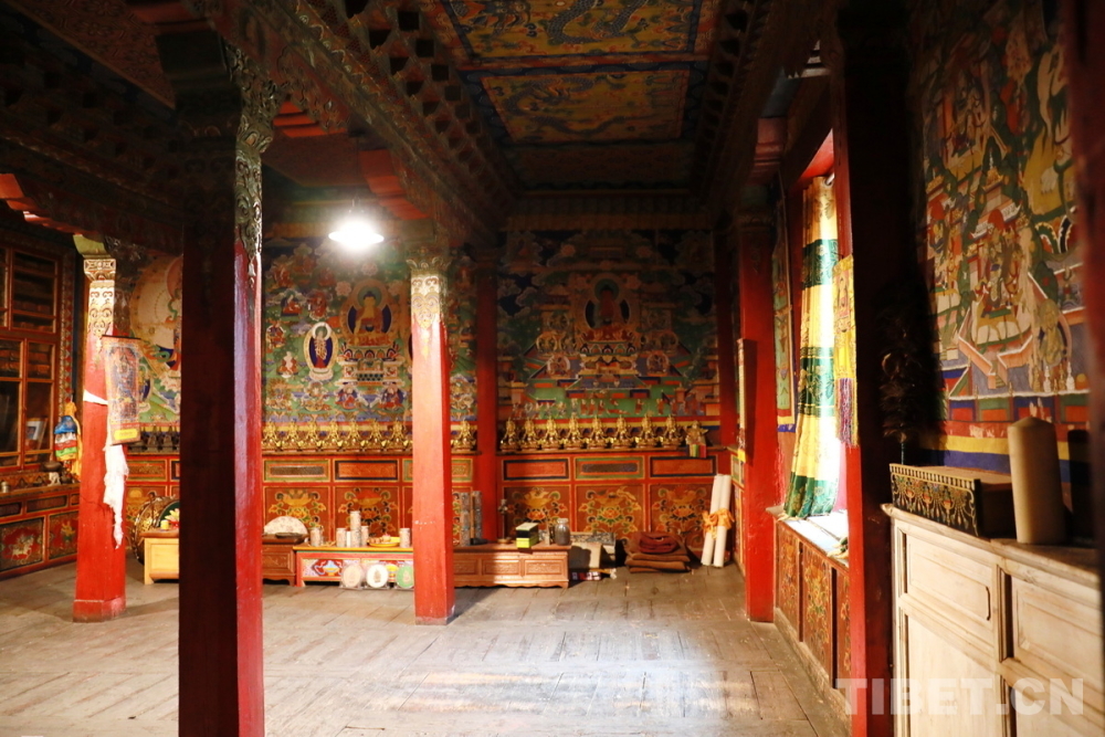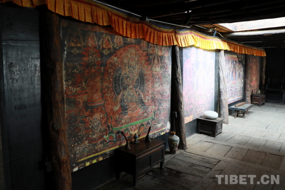 宗薩木府最驚艷的是其經(jīng)堂中歷經(jīng)380余年歷史仍色彩絢麗、保存完整的整堂壁畫。新中國(guó)成立后,宗薩木府曾被收歸公有,許多無(wú)房的當(dāng)?shù)刎毨罕姳话才抛∵M(jìn)了這里?!拔母铩睍r(shí)期,宗薩木府的經(jīng)堂被作為村里的倉(cāng)庫(kù),人們用報(bào)紙糊住壁畫,使這些藝術(shù)珍品沒(méi)有受到“破四舊”的影響。