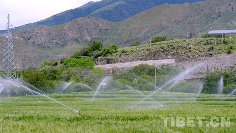 圖為西藏洛隆縣俄西鄉(xiāng)現(xiàn)代農(nóng)業(yè)產(chǎn)業(yè)園內(nèi)正在噴灑作業(yè)的灌溉設備