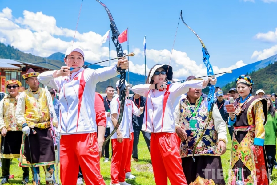圖為奧運(yùn)冠軍同當(dāng)?shù)卮迕褚煌w驗(yàn)西藏傳統(tǒng)體育項(xiàng)目工布響箭