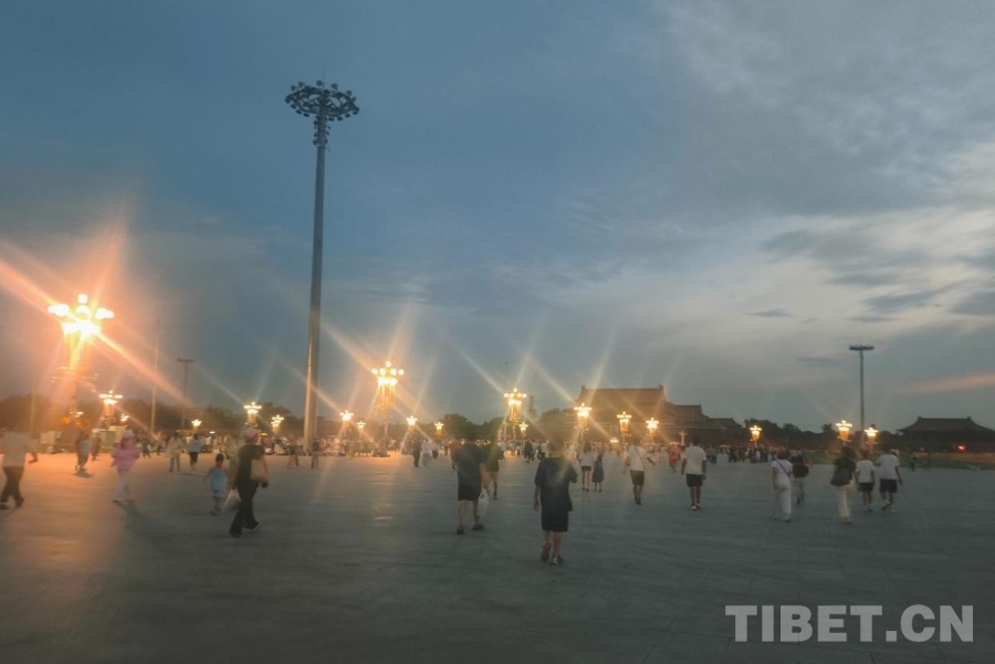 暑期的天安門廣場更加熱鬧,不僅有一家老幼同游的家庭,有旅行社帶來的各地旅游團,最多的是各種學(xué)校、團體組織的大大小小的學(xué)生團,他們身著不同顏色款式的服裝,共同等待著激動人心的時刻?!吧胶油}·京華筑夢”研學(xué)團的少年們便是其中一員,他們穿著淺藍(lán)色的T恤,戴著白色的棒球帽,散發(fā)著西藏少年的朝氣。