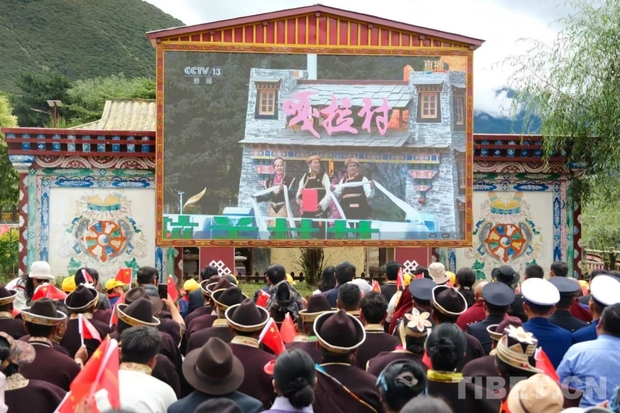 圖為嘎拉村村民觀看西藏自治區(qū)成立60周年慶祝大會 林芝市委宣傳部供圖