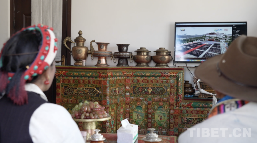 圖為邊巴與家人在災(zāi)后重建新居中觀看西藏自治區(qū)成立60周年慶祝大會 定日縣融媒體中心供圖