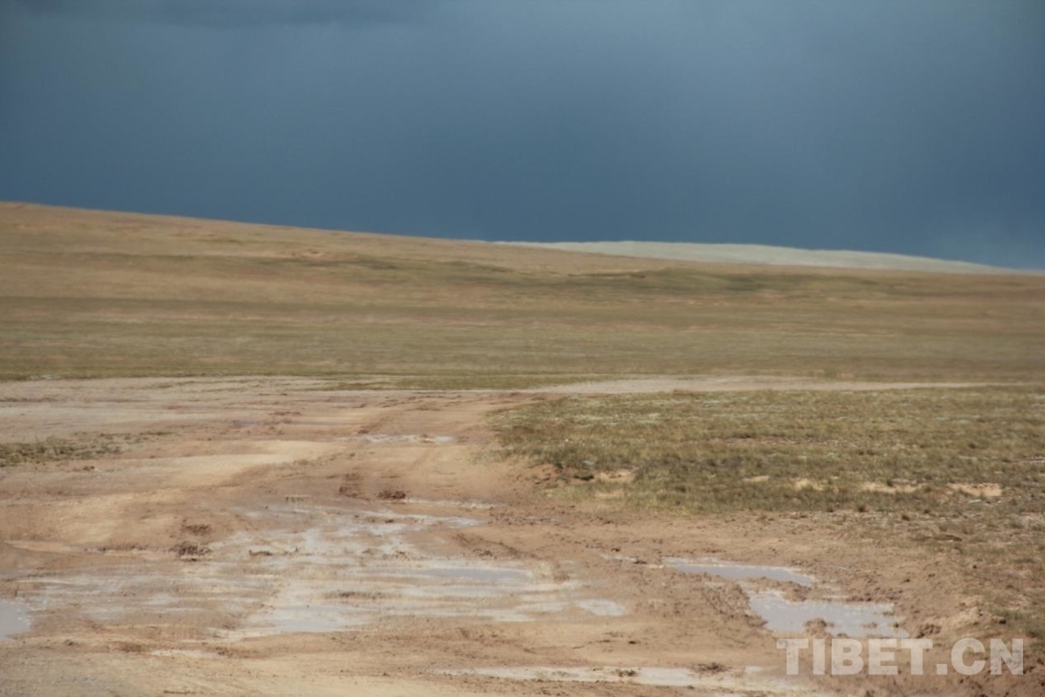 無人區(qū)的天氣是片段式的,前腳還晴著,下步走進一塊雨云下,車子就又會被淋個透。我們的車就中招了,在一片黑云壓頂后,刷刷的小雨下了起來,不久又變成了冰雹。小小的冰塊砸在路上融化,很快就把干的泥土裹了起來,路上頓時變得泥濘不堪。如果說石子路的顆粒感顛得人頭暈,那么雨后泥路就黏黏糊糊的,車子仿佛在浸滿水的海綿上走,快不了,也起不來。漸漸地,雨水大起來,漸漸匯成小溪,車輛駛過,又是一片水花四濺。