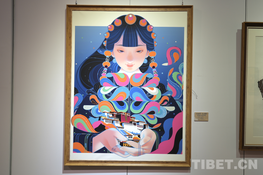 展覽現(xiàn)場(chǎng),參展藝術(shù)家李旻的作品《虹光圣城》色彩絢麗,構(gòu)思新穎,引得眾多觀眾駐足觀看。據(jù)介紹,本幅作品是一副綜合運(yùn)用了現(xiàn)代藝術(shù)創(chuàng)作手段的數(shù)字繪畫(huà),同時(shí)融入了如布達(dá)拉宮、藏裝等經(jīng)典的藏式元素,畫(huà)面生動(dòng),色彩鮮艷,形式新穎,展現(xiàn)了當(dāng)代西藏藝術(shù)的傳承與創(chuàng)新,是本次展覽極具代表性的作品之一。