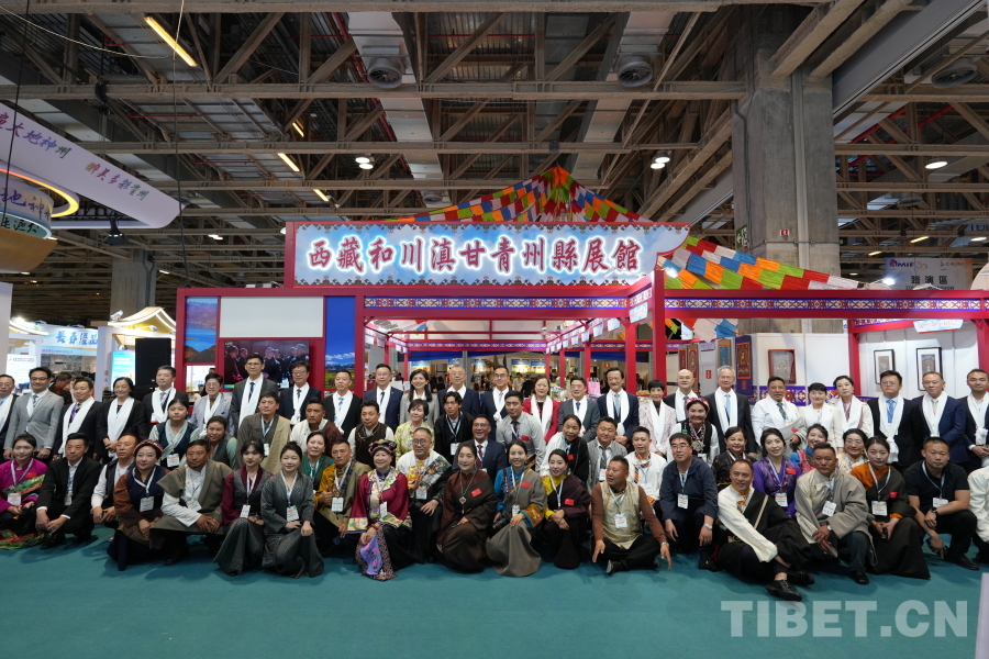 圖為參加展館開幕式的主禮嘉賓與西藏和四省涉藏州縣參展企業(yè)代表合影 攝影:楊柳青