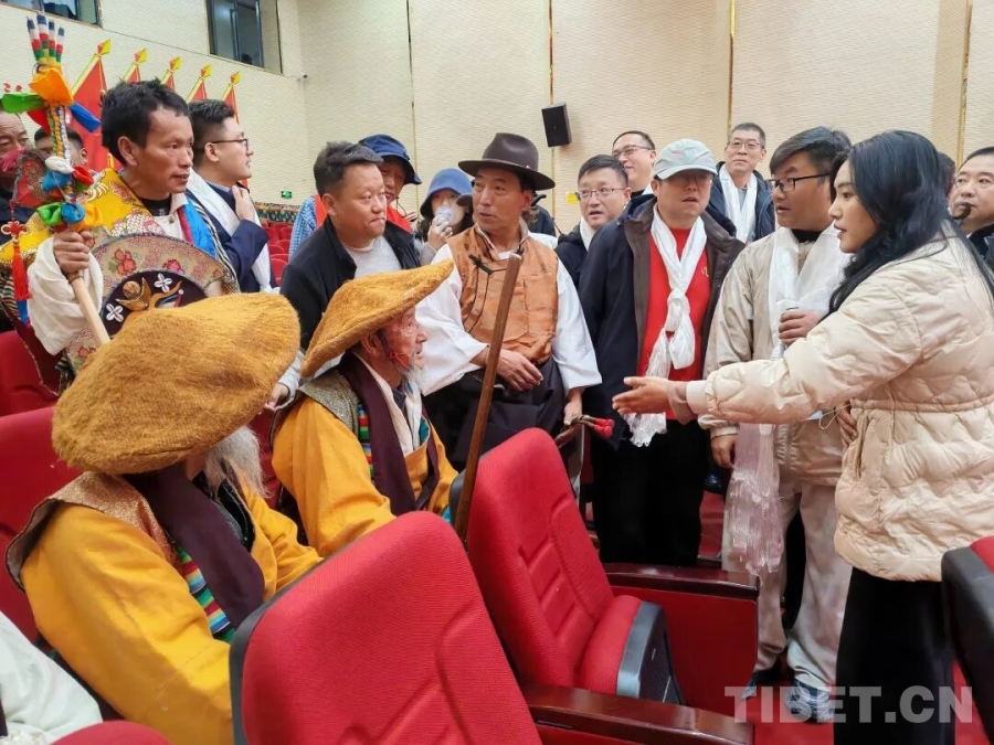在南木林縣湘巴文化藝術(shù)中心內(nèi),南木林鎮(zhèn)雪藏戲隊的演員們頭戴色彩鮮艷的五彩面具,將經(jīng)典藏戲《智美更登》選段演繹得蕩氣回腸。高亢唱腔極具穿透力,粗獷又滿含張力的舞步踏在舞臺上,每一步都踩出湘巴藏戲的獨特韻味。接著,《格薩爾說唱》的雄渾敘事、《土布加諧慶》的歡快韻律、《扎木念》的悠揚曲調(diào)一一上演,一場非物質(zhì)文化遺產(chǎn)的盛宴令調(diào)研組成員陶醉。他們的手機鏡頭緊緊追隨演員,將精妙的表演、動人的唱腔定格。表演間隙,調(diào)研組的藝術(shù)家們與演員圍坐在一起,圍繞表演技巧展開深入交流,探討唱腔中氣息的綿長運用,研究舞步里節(jié)奏的細微變化。在思想的碰撞中,藏戲藝術(shù)的傳承創(chuàng)新脈絡愈發(fā)清晰。