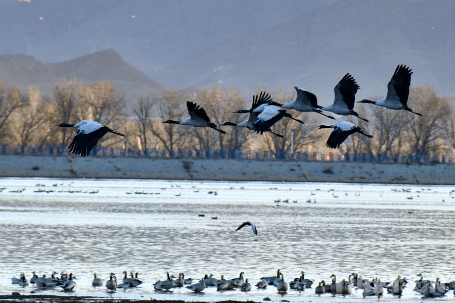 黑頸鶴是世界上最晚被發(fā)現(xiàn)的一種鶴類,是全球15種鶴類中唯一一種繁殖和越冬都在高原地區(qū)的鶴類,也是中國特有的珍稀鶴類,屬國家一級保護野生動物,在《中國生物多樣性紅色名錄—脊椎動物卷》(2020)中被列為易危(VU)物種。它們主要棲息于海拔2500米至5000米之間的高原濕地,曾因環(huán)境惡劣、食物匱乏導(dǎo)致種群數(shù)量岌岌可危,因此被譽為“鳥類大熊貓”,它們飛越崇山峻嶺,甚至飛過世界之巔——珠穆朗瑪峰,飛行高度可達(dá)萬米。據(jù)學(xué)者觀察,黑頸鶴主要分布于中國甘肅、新疆、西藏、青海、云南、四川西部、貴州和內(nèi)蒙古。每年冬季,大批黑頸鶴從繁殖地遷徙到雅魯藏布江中游河谷地帶越冬,而拉薩市林周縣是黑頸鶴在此重要的越冬地之一,黑頸鶴數(shù)量可達(dá)到2000余只。