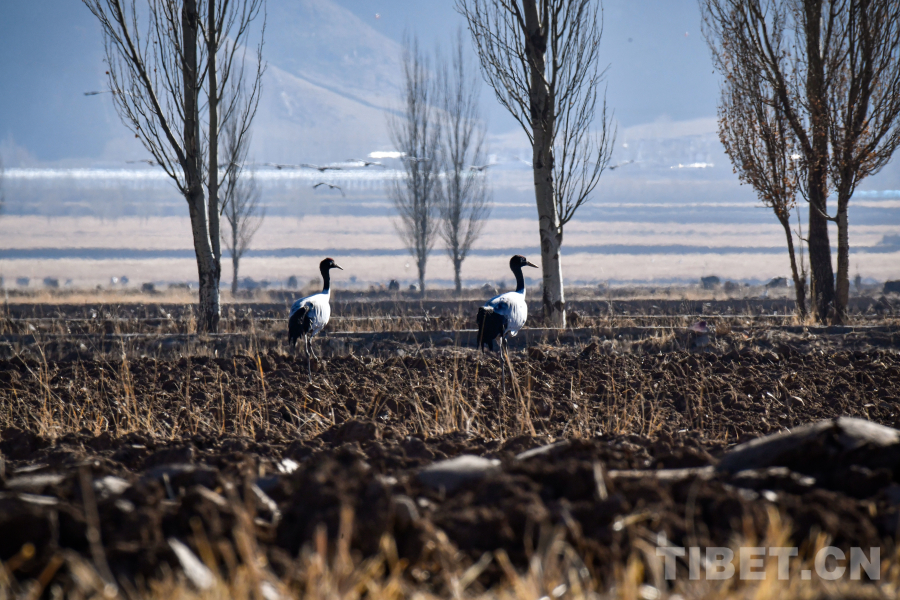 圖為拉薩市林周縣境內(nèi)正在田野中覓食的黑頸鶴(攝于11月23日)攝影:趙振宇