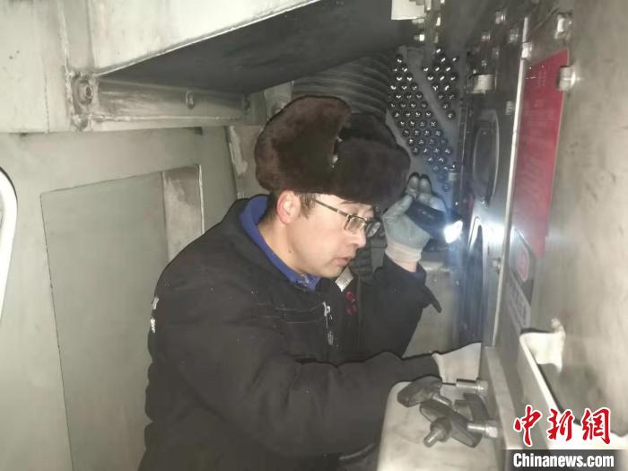 圖為封小軍檢查機(jī)車(chē)電器部件。陳勇 攝