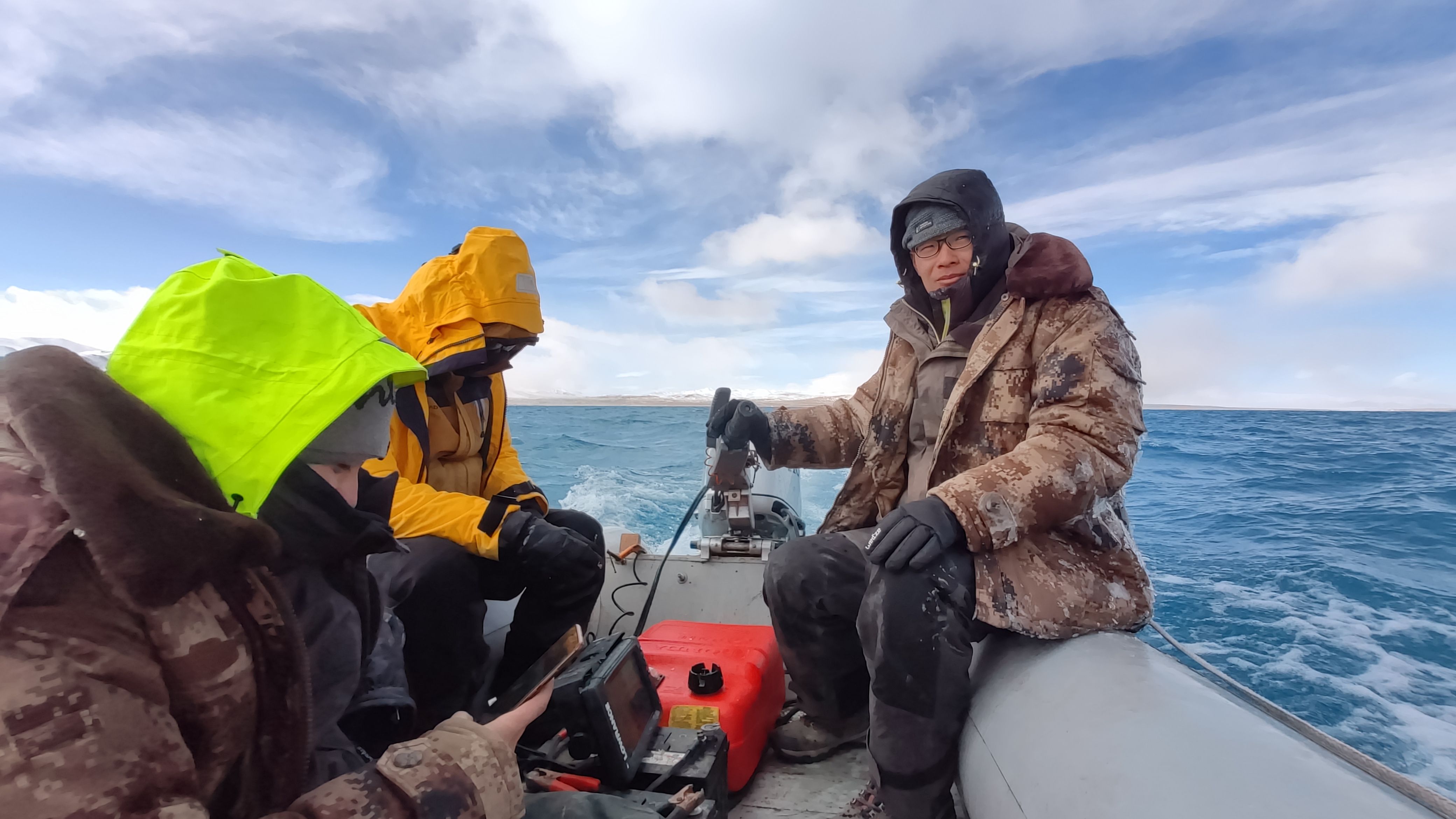 慢慢地,科考隊(duì)掌握了規(guī)律——湖面經(jīng)常下午四五點(diǎn)起風(fēng)。為躲避風(fēng)浪,隊(duì)員們冒著低溫早起工作,下午起風(fēng)的時(shí)候收隊(duì)。如果天氣好,趕上哪天下午沒(méi)怎么刮風(fēng),大家就一鼓作氣干到晚上十一二點(diǎn)再回營(yíng)。
