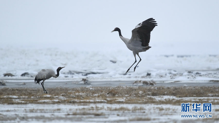 4月17日,受冷空氣影響,青海省海北藏族自治州剛察縣迎來一場春雪,兩只雪域“精靈”黑頸鶴在青海湖仙女灣景區(qū)“與雪共舞”,上演青海湖畔最美“雪中情”。