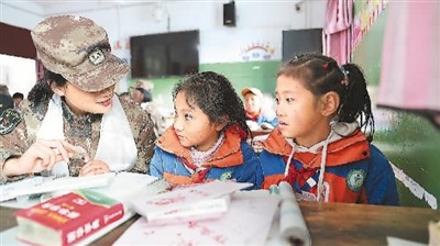 任務(wù)途中,官兵來到沿線藏族中學(xué),與孩子們做游戲、輔導(dǎo)功課,開展國防教育,讓愛灑滿雪域高原。郭宏 攝