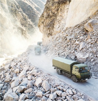 執(zhí)行任務(wù)時通過滾石區(qū)的車隊。沈奧 攝