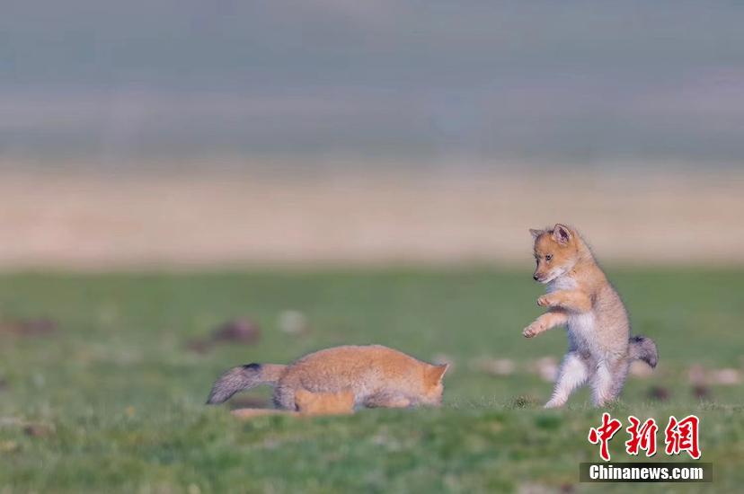 圖為狐貍媽媽與小狐貍在草原上嬉戲。 趙時春 攝