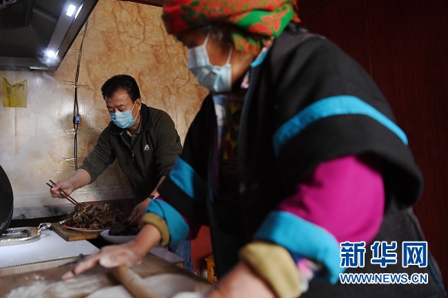 勒阿村駐村第一書記張金利(左)幫著村民屠魯列一起做午飯(4月21日攝)。 新華社記者 陳斌 攝