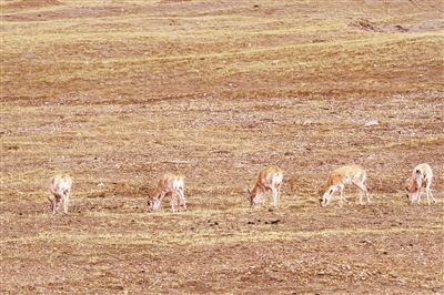 懷孕的母藏羚羊通過青藏公路生命通道后,正在覓食。
