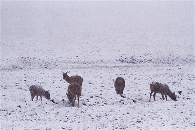 下午6時35分,該地突降大雪,記者在守候了1小時2分后,23只前往卓乃湖產(chǎn)仔的藏羚羊,在五道梁保護(hù)站民警雙向禁停車輛的守護(hù)下,均平安通過青藏公路。