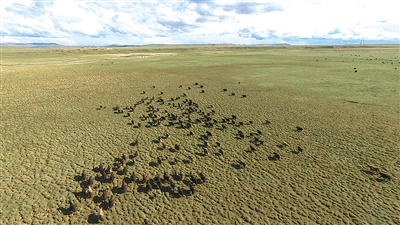 草原返青后,曲麻日合作社的牛群被放出畜棚,散落在廣袤草場(chǎng)上。張海麟 攝