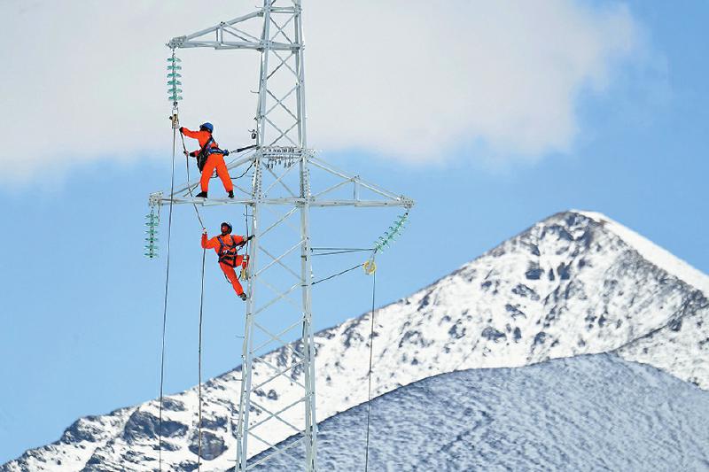 5月17日,雪后初霽。在理塘—下壩35千伏線路工程施工現(xiàn)場,架線人員踩著厚厚的積雪進(jìn)行展線施工。