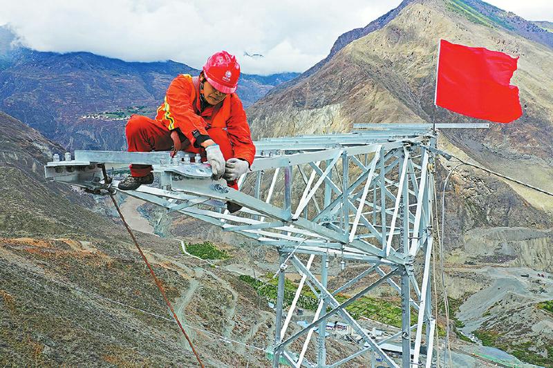 5月24日,甘孜州巴塘縣中咱-蘇洼龍35千伏線路工程78號塔放線現(xiàn)場,施工人員正在塔上進(jìn)行放線作業(yè)。
