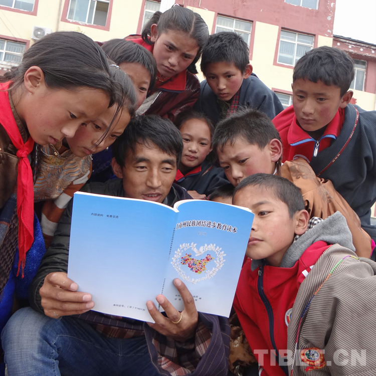 圖為甘南州瑪曲縣齊哈瑪鄉(xiāng)寄宿制學(xué)校的師生在學(xué)習(xí)《甘南州民族團(tuán)結(jié)進(jìn)步教育讀本》