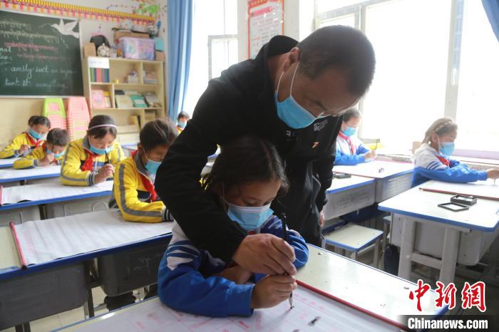 8月31日,在來塘村學校,完么仁增老師在指導一年級學生馬秀梅學習。新華社記者 張龍 攝