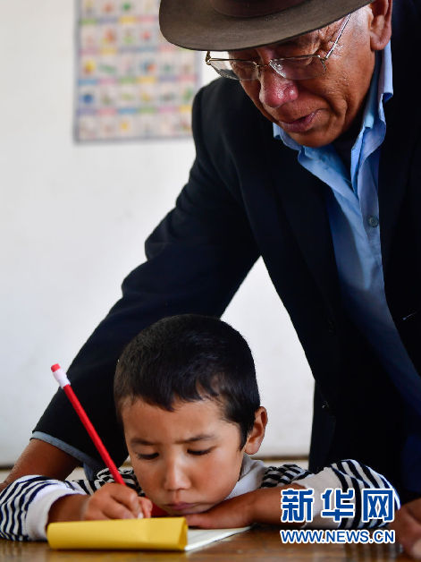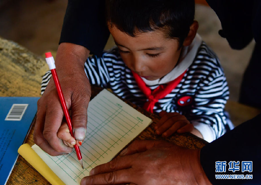 8月31日,在來塘村學校,完么仁增老師在指導一年級學生馬文輝學習。新華社記者 張龍 攝