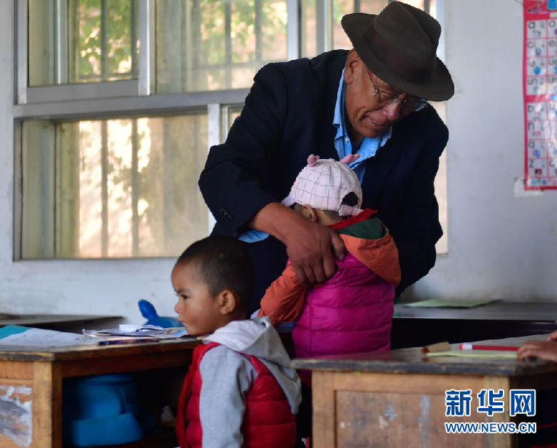 8月31日,在來塘村學校,完么仁增老師在上課前將學前班的孩子馬玲抱到椅子上。新華社記者 張龍 攝