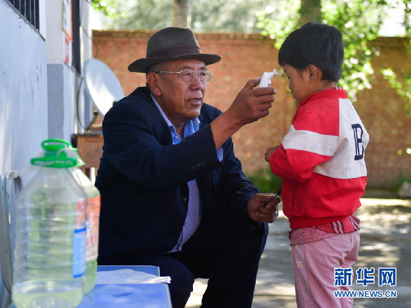 8月31日,在來塘村學校,完么仁增老師在給前來上課的孩子量體溫。新華社記者 張龍 攝