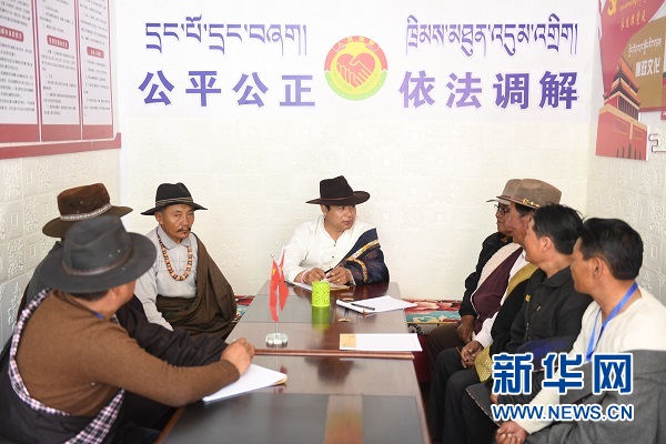 “官卻個人調(diào)解工作室”(中為官卻)為當?shù)厝罕娬{(diào)解矛盾糾紛。新華網(wǎng) 潘彬彬 攝