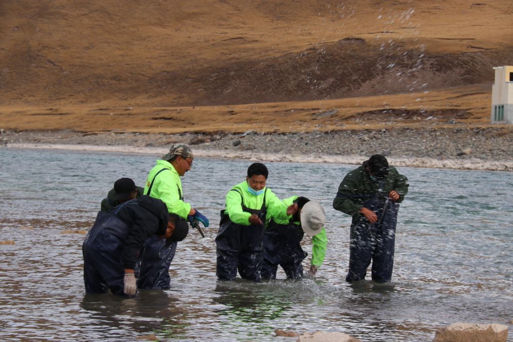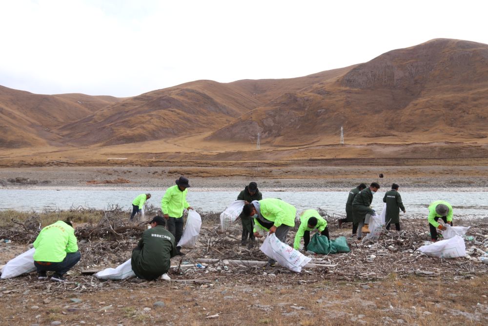 三江源國家公園治多生態(tài)環(huán)保協(xié)會的志愿者在清理河道內的垃圾(7月11日攝)。新華社發(fā)