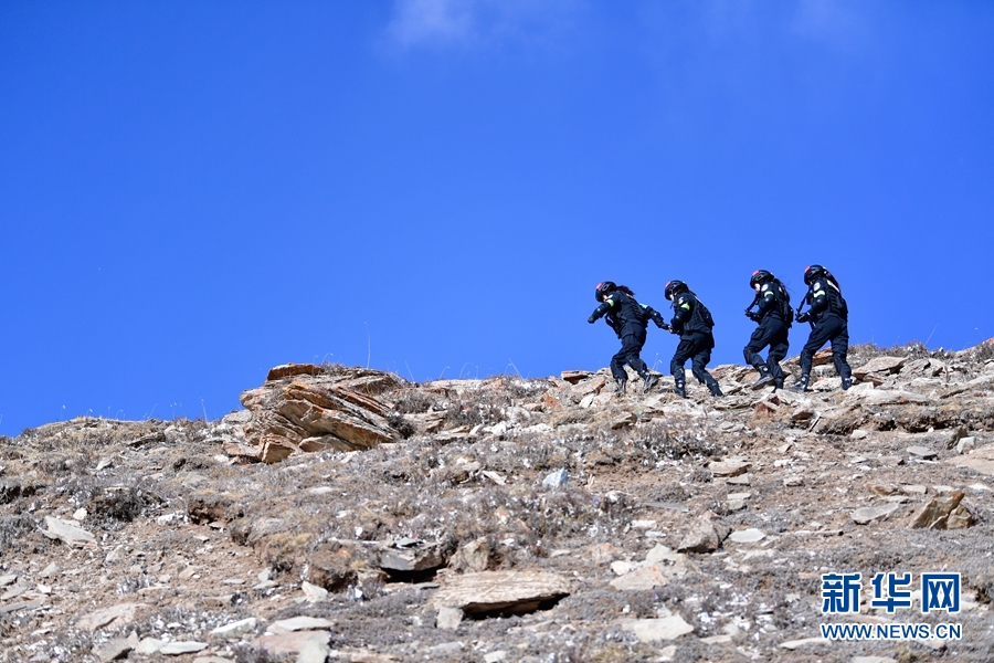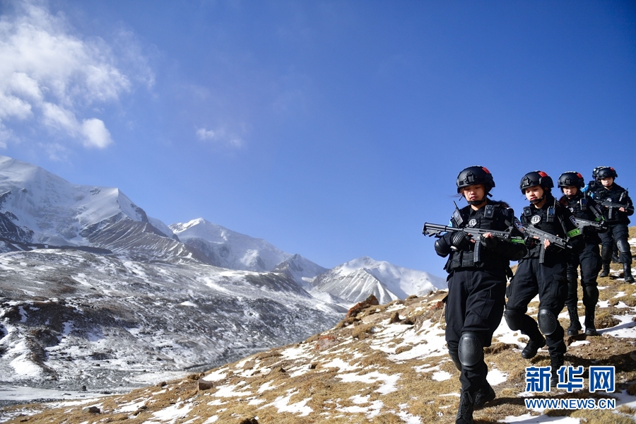 1月9日,青海省果洛藏族自治州公安局特警支隊(duì)直屬女子中隊(duì)的隊(duì)員們?cè)诎⒛岈斍渖侥_下參加高原野外適應(yīng)性訓(xùn)練。新華社記者 張龍 攝