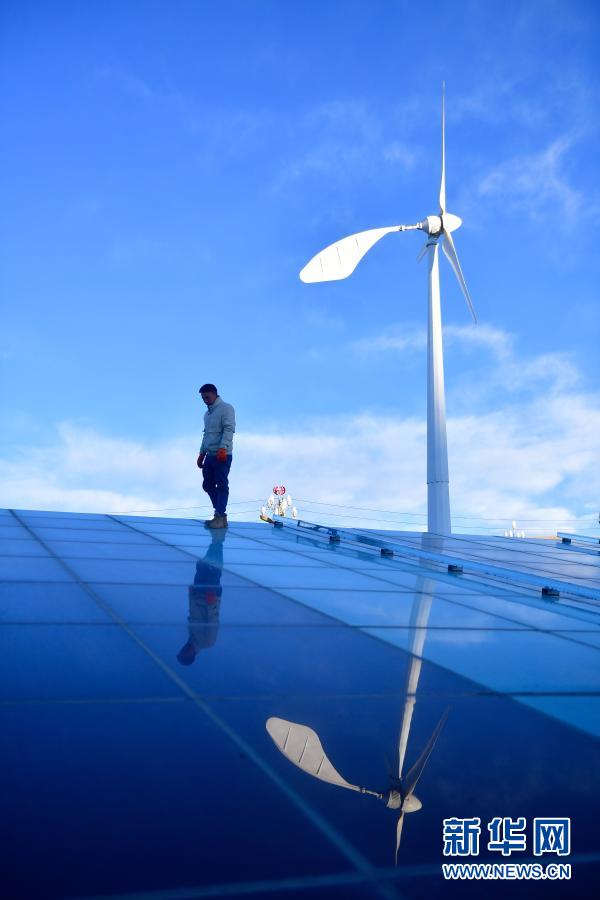1月13日,在青海省果洛藏族自治州農(nóng)牧業(yè)生態(tài)科技示范園,工作人員董志強在查看大棚光伏板。 新華社記者 張龍 攝