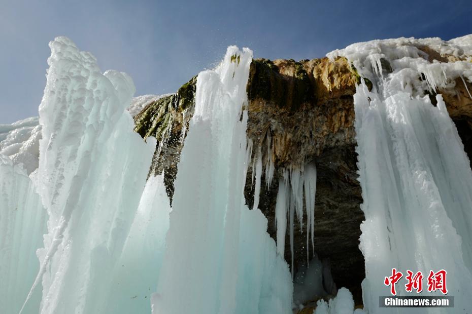 2021年1月23日,祁連山國(guó)家公園崗什卡雪峰山腳下的七彩冰瀑,由于溪水中含有多種礦物質(zhì),在冬日暖陽的照耀下,散發(fā)出五彩繽紛的綺麗風(fēng)光,蔚為壯觀。中新社發(fā) 成 林 攝
