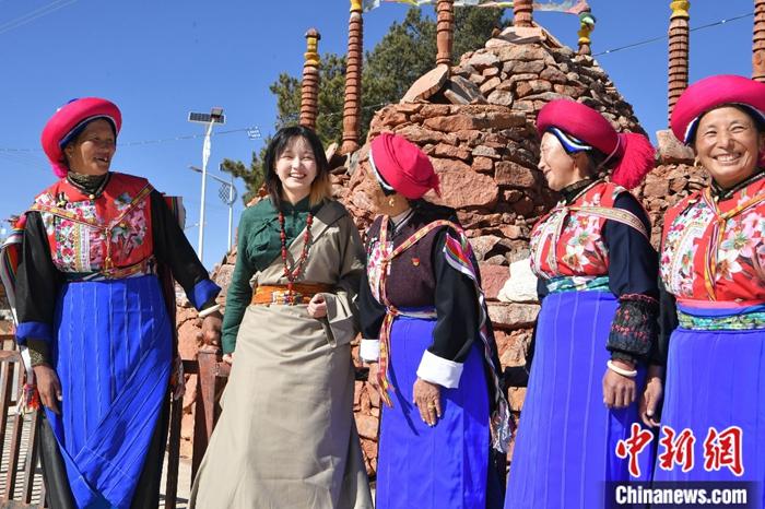 圖為穿上藏裝的格桑卓瑪(左二)在村里與長輩們聊天。中新社記者 劉冉陽 攝