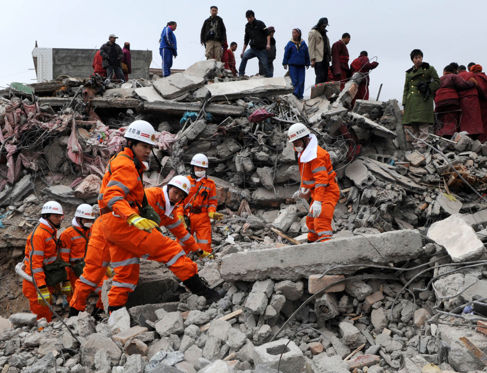 圖為2010年4月16日,救援人員在結(jié)古寺賓館進(jìn)行救援。