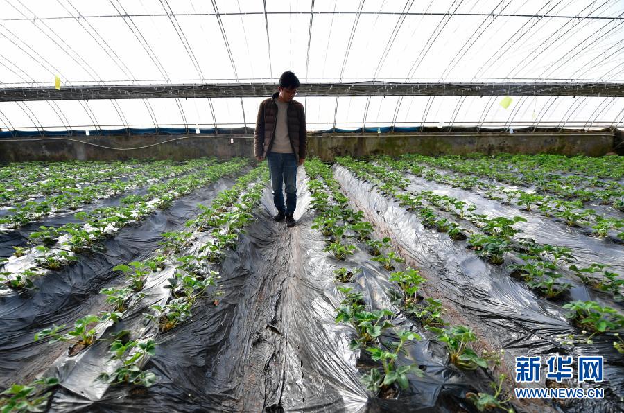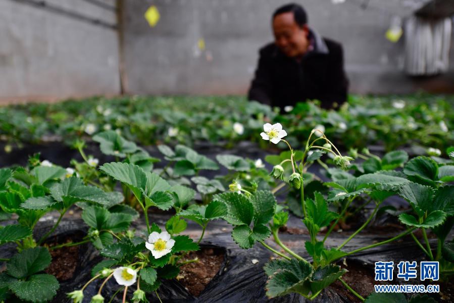 3月14日,在青海省果洛藏族自治州農(nóng)牧業(yè)生態(tài)科技示范園內(nèi),農(nóng)業(yè)技術員宋建東在查看草莓生長情況。新華社記者 張龍 攝