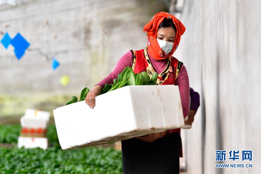 3月14日,在青海省果洛藏族自治州農(nóng)牧業(yè)生態(tài)科技示范園內(nèi),菜農(nóng)桑吉卓瑪在搬運蔬菜。新華社記者 張龍 攝