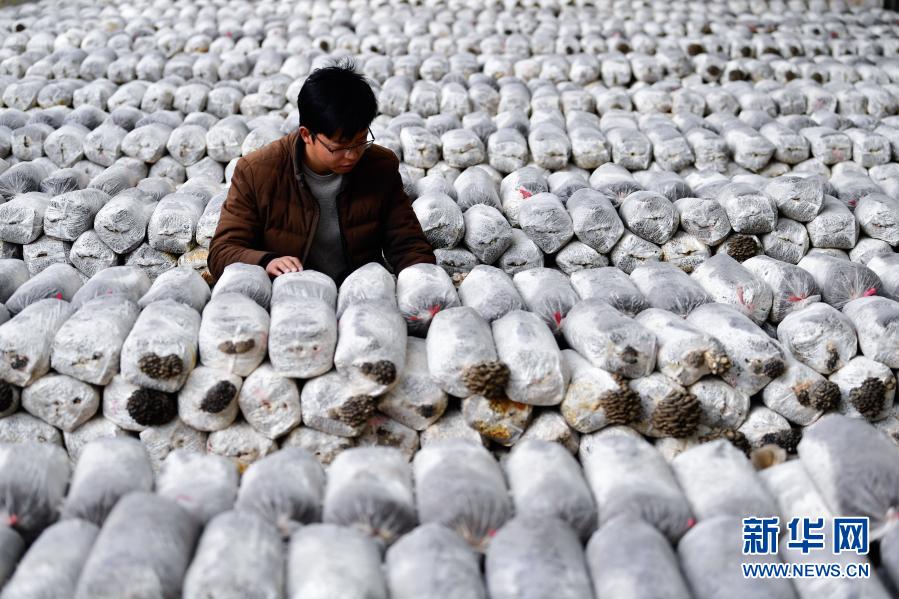 3月14日,在青海省果洛藏族自治州農(nóng)牧業(yè)生態(tài)科技示范園內(nèi),農(nóng)業(yè)技術員宋建東在查看平菇生長情況。新華社記者 張龍 攝