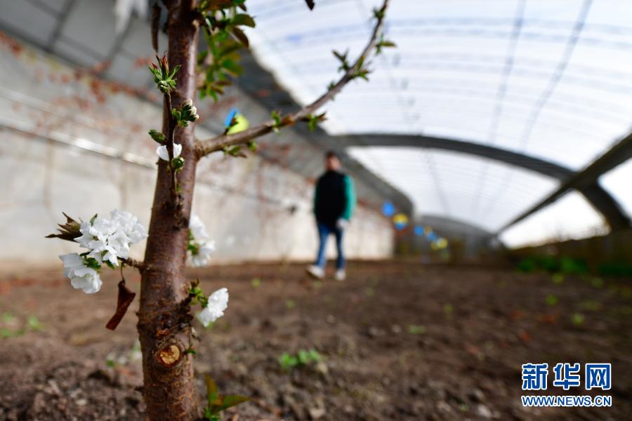 3月14日,在青海省果洛藏族自治州農(nóng)牧業(yè)生態(tài)科技示范園內(nèi),農(nóng)業(yè)技術員冷治在櫻桃樹種植棚內(nèi)工作。新華社記者 張龍 攝