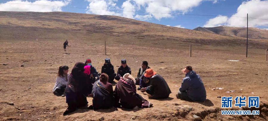 在青海省果洛藏族自治州瑪沁縣優(yōu)云鄉(xiāng),糾紛調(diào)解工作組的多杰扎西(后排穿警服右)、仁青卓瑪(后排穿警服左)和牧民們席地而坐,了解矛盾的詳細情況(4月18日攝)。新華社發(fā)