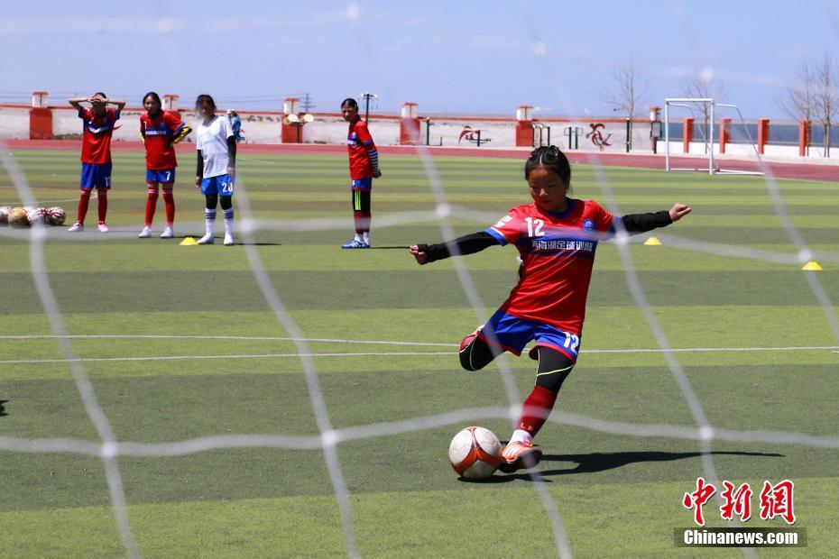 4月21日,青海省海南藏族自治州共和縣,青海湖民族寄宿制學(xué)校的足球場(chǎng)上,女子足球隊(duì)的隊(duì)員們正在進(jìn)行訓(xùn)練。該校的女子足球隊(duì)共有小學(xué)組、初中組隊(duì)員53人,皆為來自牧區(qū)的藏族女孩。中新社記者 馬銘言 攝