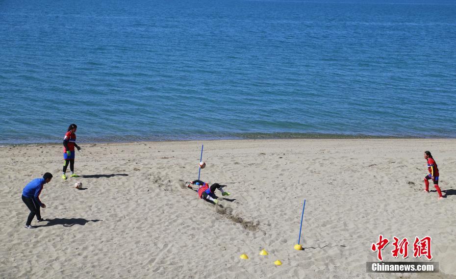青海湖民族寄宿制學(xué)校女子足球隊(duì)的隊(duì)員們?cè)谇嗪:仙碁┥线M(jìn)行訓(xùn)練。中新社記者 馬銘言 攝
