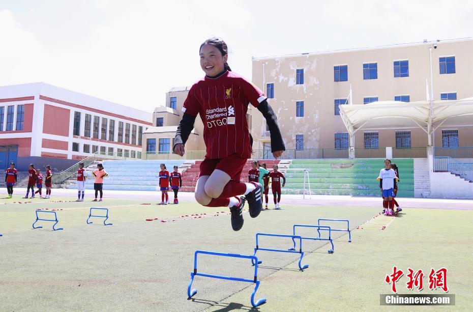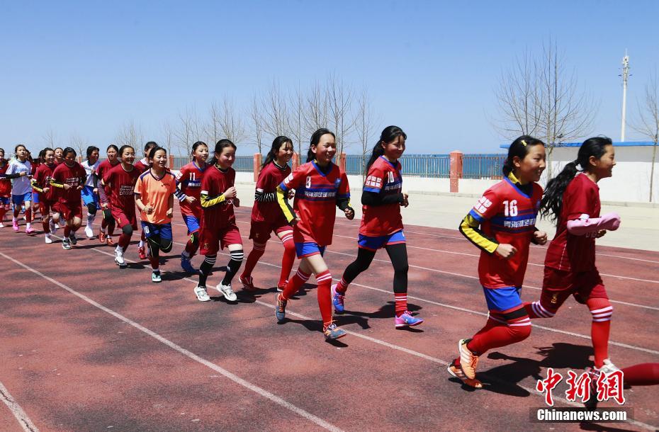 青海湖民族寄宿制學(xué)校的足球場(chǎng)上,女子足球隊(duì)的隊(duì)員們正在進(jìn)行跑步熱身。中新社記者 馬銘言 攝