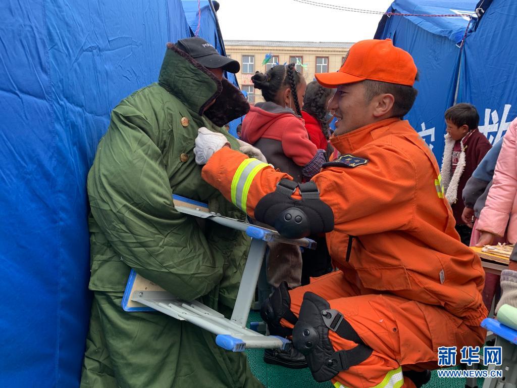22日,地震發(fā)生后,群英尕丁來到安置區(qū)搭建帳篷和消防排查,12歲的班瑪華桑就與身穿橙色制服的群英尕丁結(jié)下了兄弟情誼。“我們是一輩子的兄弟,這幾天你也要照顧好自己?!比河㈡囟⌒χ鴩诟腊喱斎A桑。