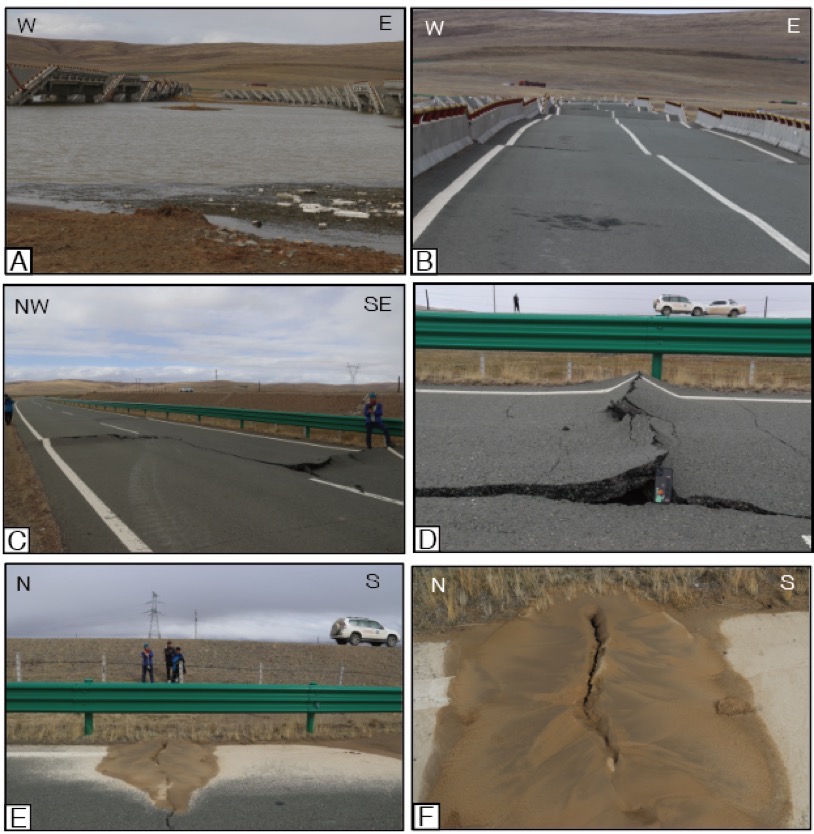 應(yīng)急考察隊(duì)相關(guān)負(fù)責(zé)人介紹,考察隊(duì)在白瑪納村附近發(fā)現(xiàn)地震次生破裂多處,黃河鄉(xiāng)附近向北西二十多公里地表破壞較為嚴(yán)重,破裂帶整體走向近120度,沿線隨處可見張裂隙、砂土液化等現(xiàn)象,路旁電線桿傾斜嚴(yán)重。接近G214國(guó)道一處地表破裂切過公路形成最大左行位錯(cuò)量。根據(jù)野外現(xiàn)象觀察,斷裂具有左行走滑兼正斷的運(yùn)動(dòng)學(xué)特性。