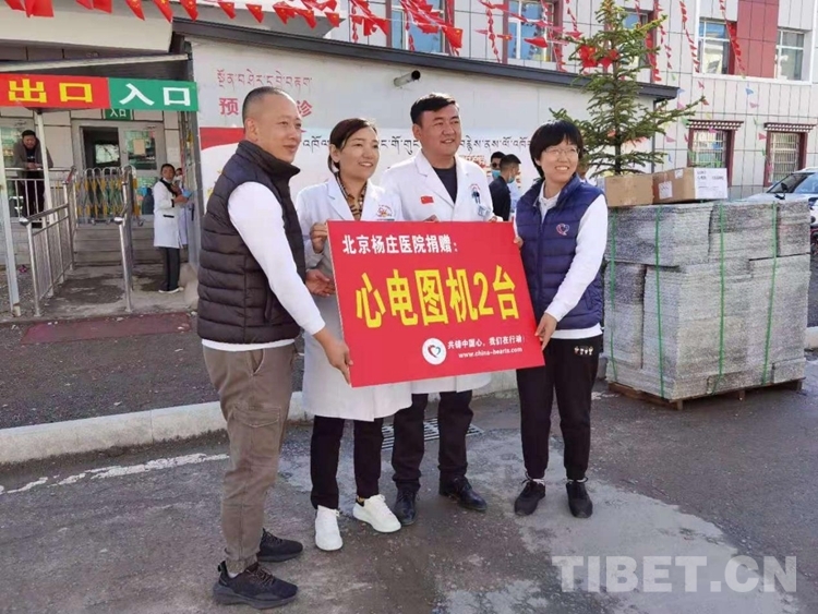 圖為馮亞靜和韓菲代表石景山楊莊醫(yī)院向久治縣醫(yī)院贈送兩臺心電圖機