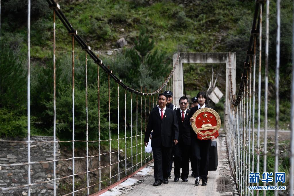 8月7日,班瑪縣人民法院工作人員在林區(qū)懸掛國徽,布設(shè)巡回法庭。新華社記者 張龍 攝