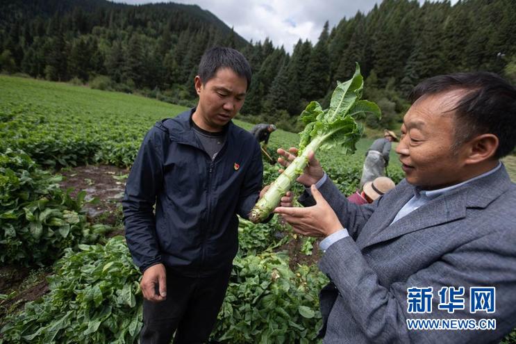 8月13日,在四川省阿壩藏族羌族自治州紅原縣刷經寺鎮(zhèn)加當村,農業(yè)技術推廣研究員茍俊(前右)在查看收獲的萵筍生長情況。新華社記者 江宏景 攝